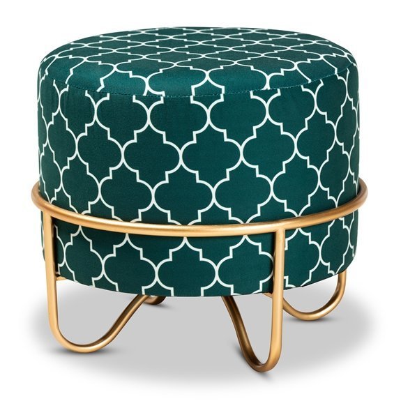 Baxton Studio Candice Glam and Luxe Teal Green Quatrefoil Velvet Fabric Upholstered Gold Finished Metal Ottoman