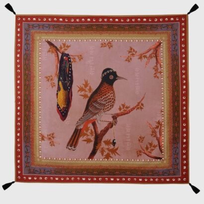 The Rose Hututi Rug carries the essence of the land of morning calm – Korea – through motifs of its native birds. Crafted in light-weight canvas on a warm pastel base, and finished with statement tassels, this detailed rug can double up as an addition to cozy bedrooms as a throw or as an accent for monochromatic ottomans.